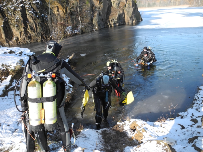 Über Mittag begaben sich die härtesten Taucher unter das Eis im Ammelshainer Steinbruch und wurden mit guter Sicht belohnt.